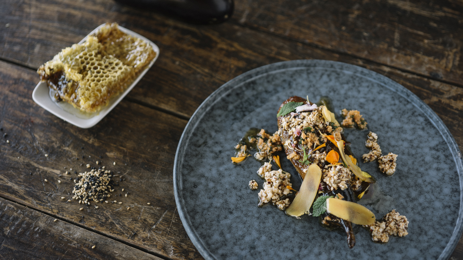 Berenjena glaseada con chimichurri de coliflor y salazón