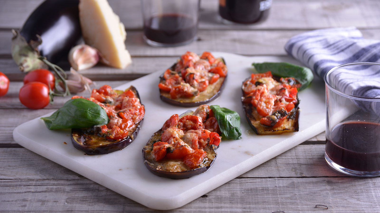 En primer lugar, cortamos la berenjena a lo largo en lonchas de medio cm aproximadamente. Cortamos los tomates en cuartos y picamos finamente el ajo. Reservamos.