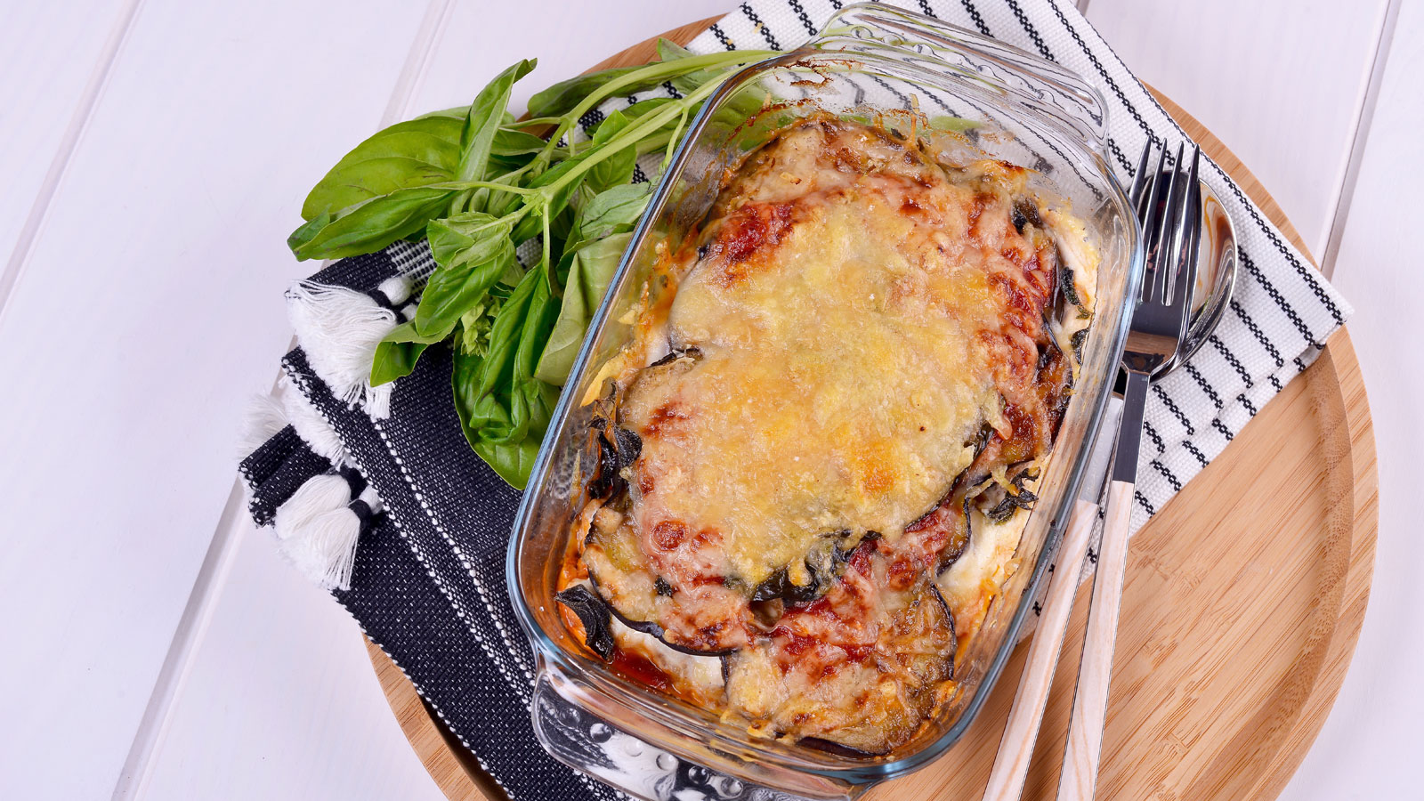 Sobre esta base, vamos a colocar las hojas de un ramillete de albahaca fresca lavada, las hojas de un ramillete de orégano fresco lavado y una primera capa de la berenjena dorada en la sartén.