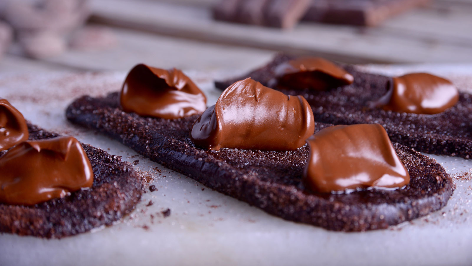 Retiramos las berenjenas de la sartén, escurriendo el exceso de aceite y, cuando aún estén calientes, las rebozamos en el plato de chocolate amargo y azúcar. Una vez rebozadas, las pasamos a un plato llano o tabla.