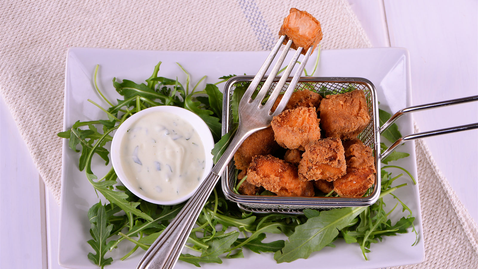 Presentamos el salmón frito con un dip de salsa y hojas de rúcula.