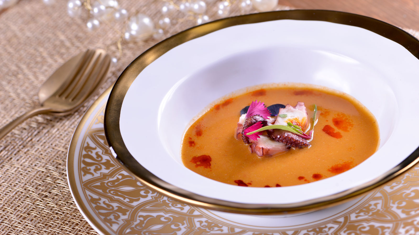 Bisqué de gamba roja con pulpo a la plancha y aceite de pimentón