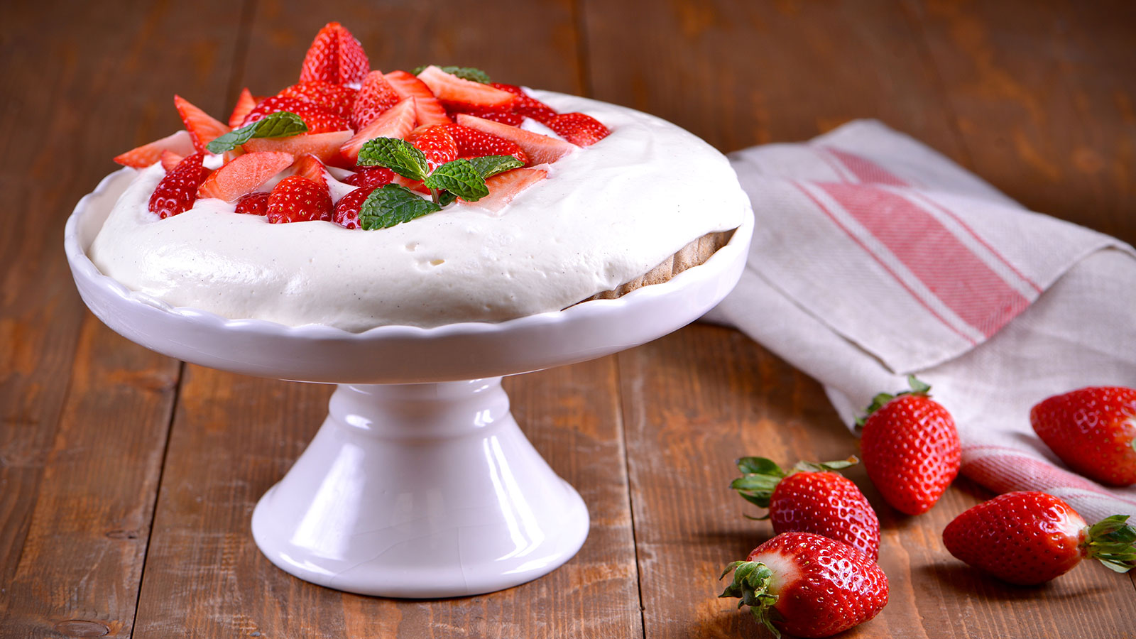 Desmoldamos el bizcocho esperamos a que se enfríe y cubrimos con la crema. Decoramos con las fresas frescas y hierbabuena.