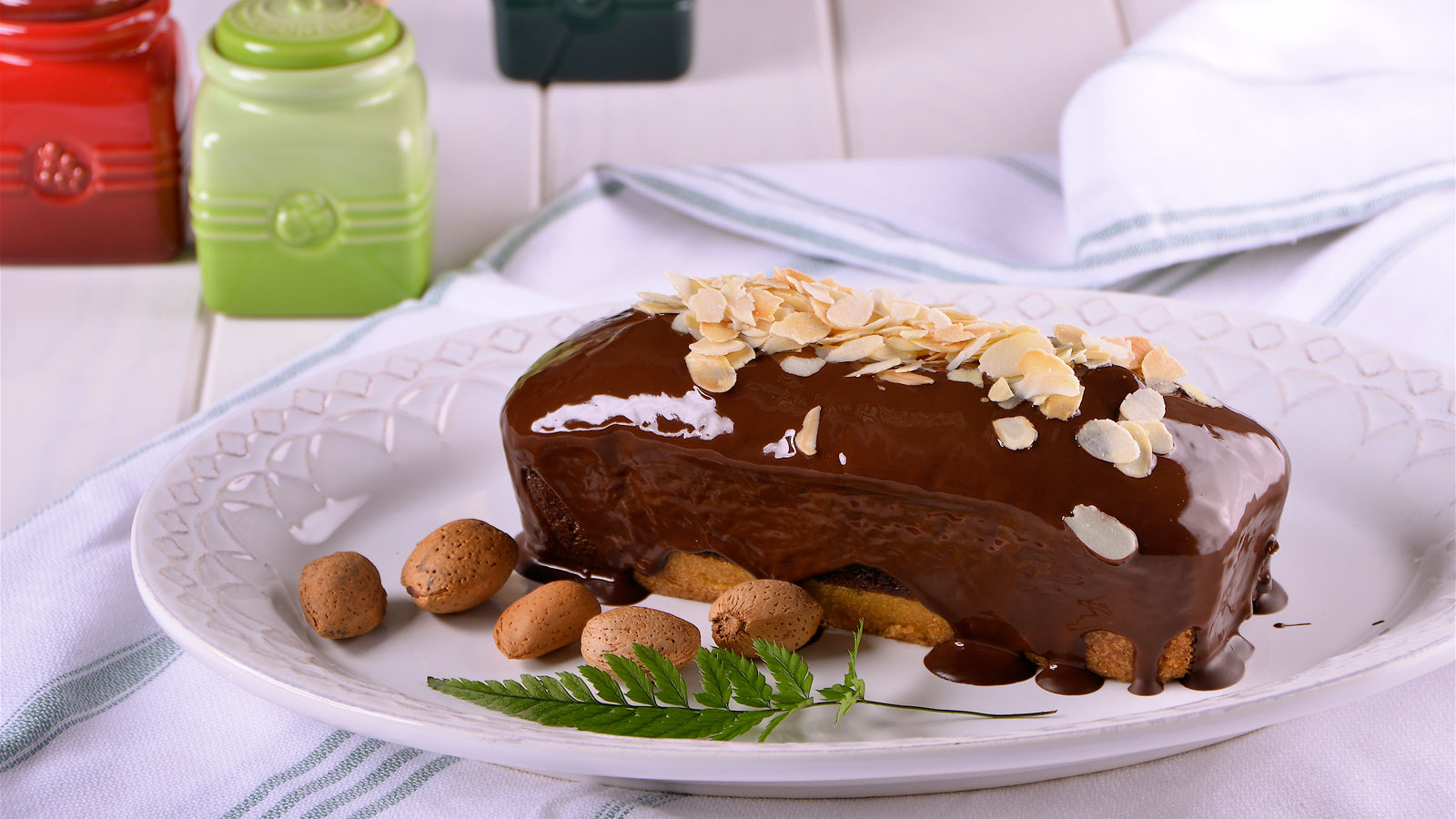 Derretimos el chocolate al baño maría o en el microondas y bañamos el bizcocho con él. Decoramos con almendras fileteadas o garrapiñadas. Servimos.