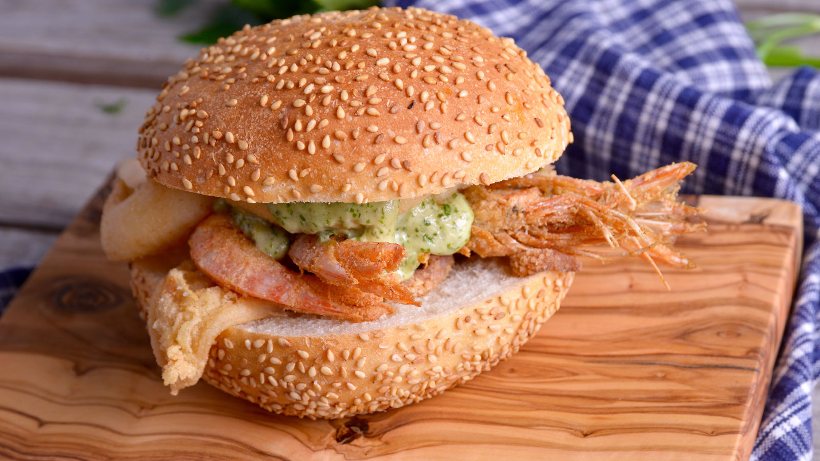 Bocadillo de fritura de marisco con mahonesa de cilantro