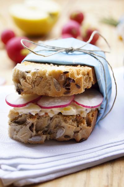 Tostaremos las rebanadas de pan de semillas variadas y sobre tres de ellas extenderemos la mezcla anterior. Sobre esta extenderemos una capa de rabanitos laminados y cubriremos con otras tres tostadas de pan de semillas variadas.