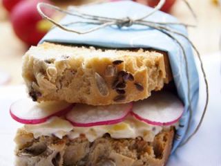 Tostaremos las rebanadas de pan de semillas variadas y sobre tres de ellas extenderemos la mezcla anterior. Sobre esta extenderemos una capa de rabanitos laminados y cubriremos con otras tres tostadas de pan de semillas variadas.