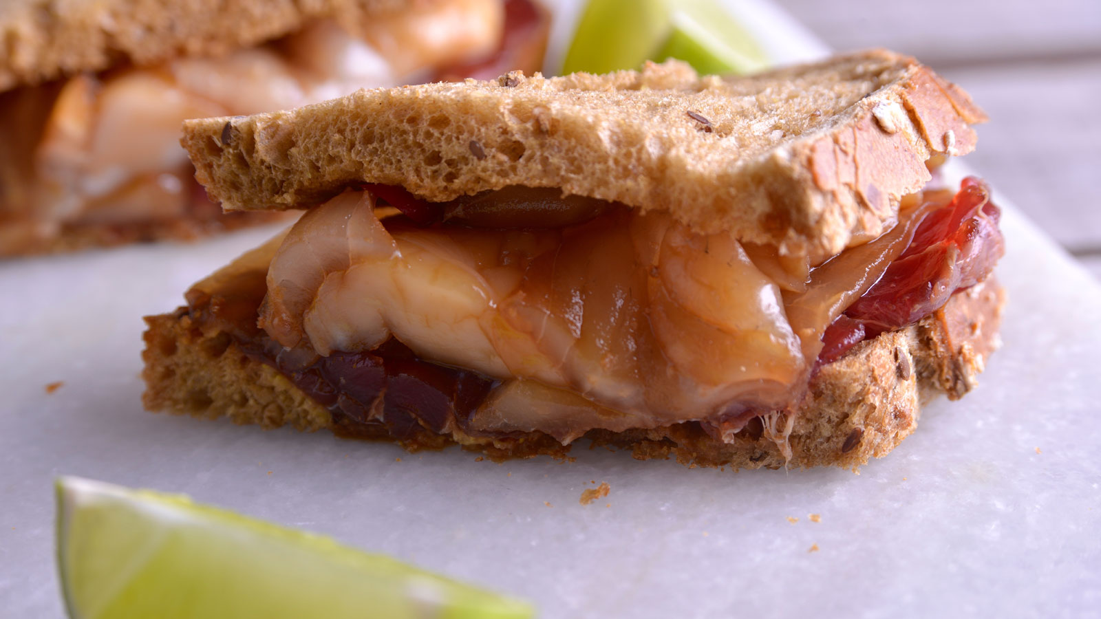 Cuando hayan tostado, untamos la mostaza en las rebanadas y cubrimos por encima con una lámina de cada pescado.