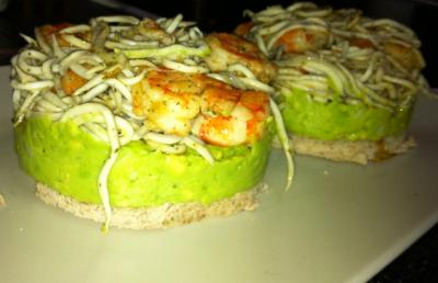 Bocaditos de gambas y falsas angulas al ajillo sobre crema de aguacate