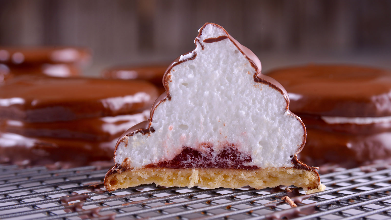 Por último, hacemos copos de merengue italiano y los echamos sobre los bocaditos. Terminamos bañando los bocaditos en chocolate fundido y dejando que éste se endurezca.