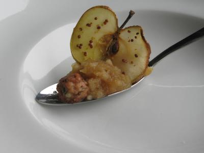 Bocado de canica especiada de morucha con nube de manzana y topitos de mostaza