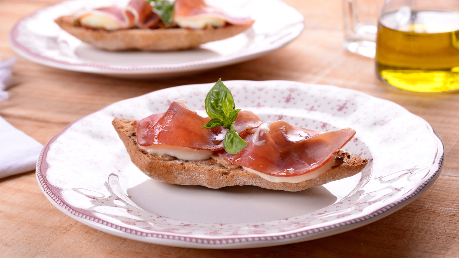Nada más sacar del horno las chapatas, las cubrimos con 200 g de jamón serrano en lonchas muy finas. Antes de servir nuestras barritas las decoramos con unas hojas de albahaca fresca y un chorrito de aceite de oliva virgen extra.