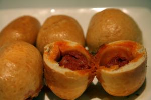 A continuación se cortan los chorizos en trocitos y se envuelven en la masa.