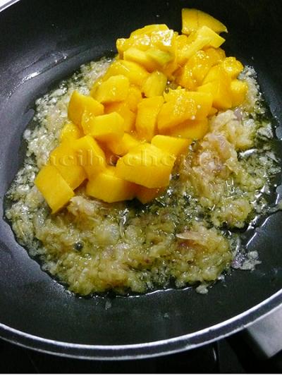 La sartén con aceite recibe a la media cebolla morada y la cebolleta bien picadas y salpimentadas, allí estarán hasta que estén bien pochadas. En ese momento añado el mango troceado y sofrío todo junto tan solo un par de minutos.