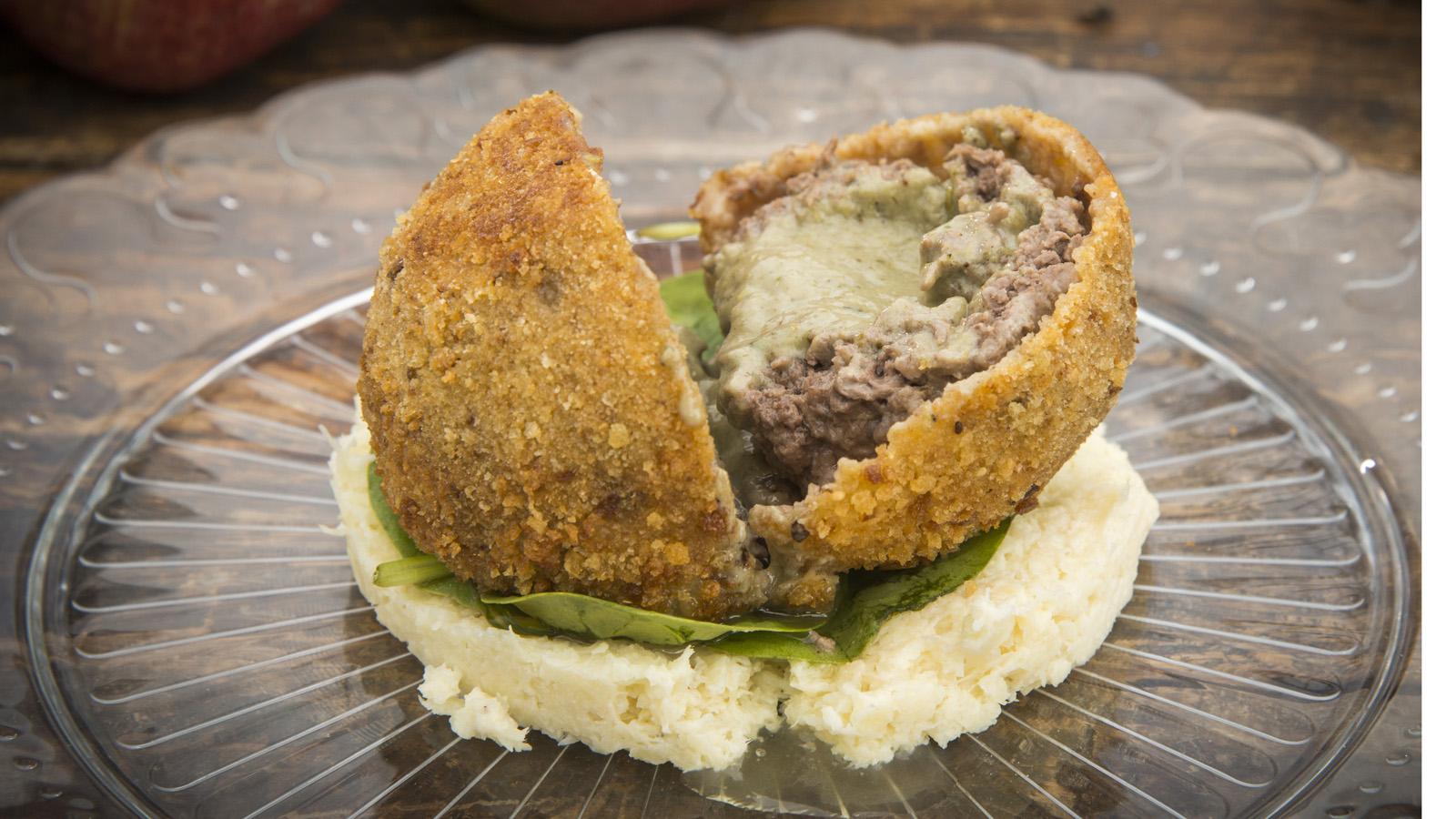 Servimos una capa de puré previamente elaborado a base de chirivía, nata y sal. Ponemos otra capa de espinacas, la bomba encima y listo.