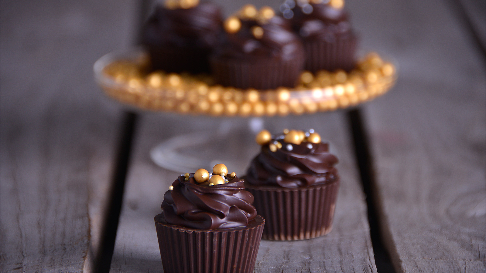 Rellenamos una manga de plástico desechable con una boquilla rizada con el chocolate mezclado con agua. Procedemos a decorar los bombones dosificando sobre la superfície un poco de chocolate. Terminamos con perlas y cristales dorados. Dejamos secar.