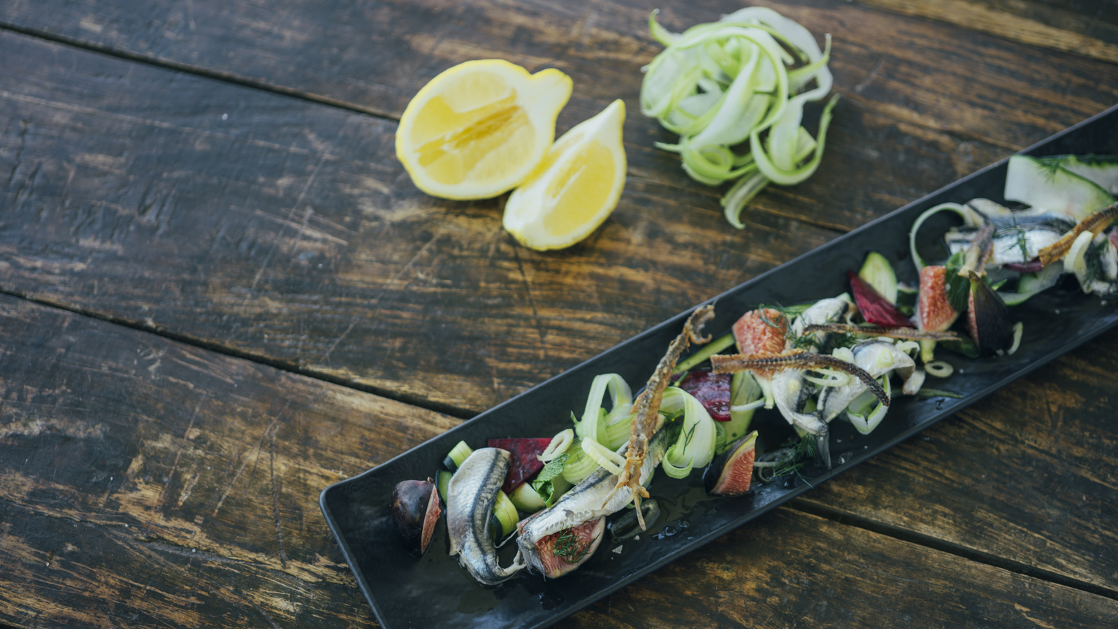 Servimos unas láminas de pepino, espárragos e hinojo y añadimos, unas brevas troceadas, unas cuñas de remolacha, unas hojas de hierbabuena y colocamos encima los boquerones, un poco de eneldo y un chorrito de aceite, sal y un poco de vinagre.