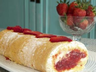 Una vez tenemos el bizcocho horneado, lo volcaremos con cuidado sobre un papel de hornear al que habremos espolvoreado un poco de azucar glas. Lo dejaremos enfriar del todo y retiraremos el papel de hornear superior con cuidado. una vez frio repartiremos la crema de queso por toda la superficie del bizcocho de forma regular. sacaremos las fresas de la nevera y las repartiremos encima de la crema de queso.Con ayuda del papel de hornear inferior comenzaremos a enrollar el brazo gitano.Una vez este listo decoramos con unas rodajas de fresas por encima. Conservar en el frigorifico hasta consumir para que el bizcocho no se seque.
