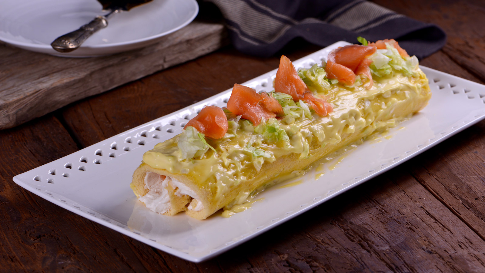 Para elaborar el relleno, mezclamos el queso con un poco de nata y el vinagre de Módena. Extendemos el bizcocho, colocamos encima el salmón y lo enrollamos.