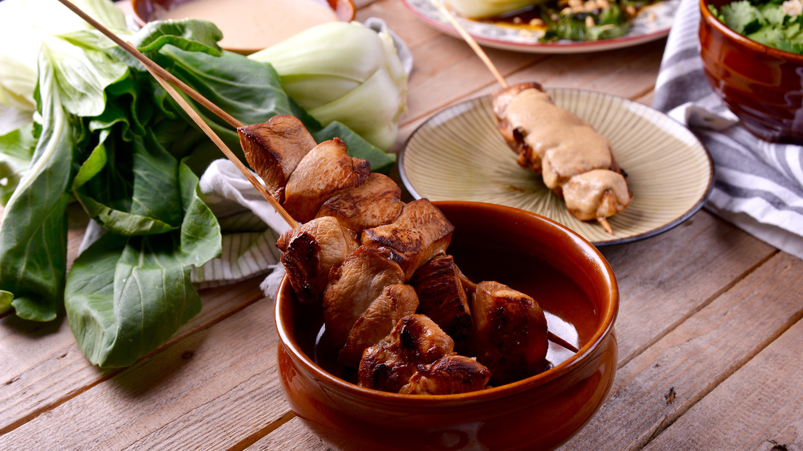 Brocheta de pollo satay con pak choi