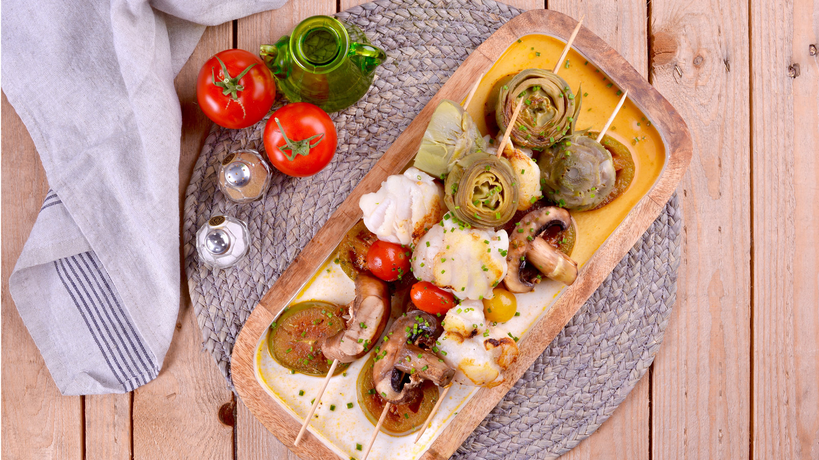 Brochetas de pescado y verduras