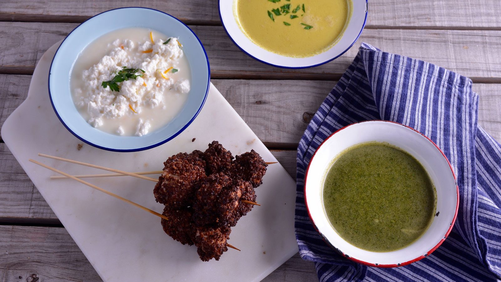Emplatamos las brochetas y acompañamos con las salsas que hemos elaborado.