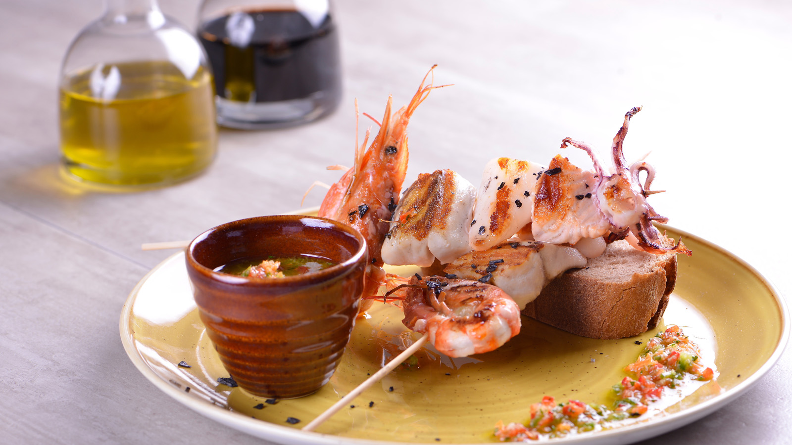 Servimos las brochetas sobre rebanadas de pan de pueblo con la vinagreta por encima y otro poco en un cuenco nuevo.