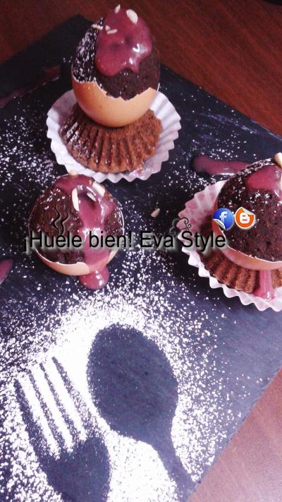 Con la ayuda de una manga pastelera rellena con cuidado cada huevo, agitalos un poco para distribuir bien toda la masa. Con la masa restante rellena cuatro moldes de magdalenas. Precalentamos el horno a 180ºC y horneamos los brownie a 150ºC 30 minutos.