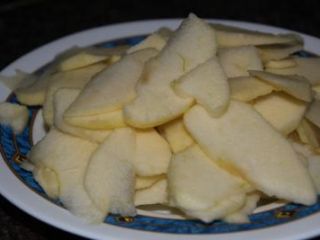 - 1.Pelar las manzanas y descorazonarlas y cortarlas en gajos. Poner a caramelizar 50 gr de azúcar hasta que coja un color marrón claro, añadir las nueces y las manzanas cortadas,dejar durante unos 2 minutos.Retirar del fuego y dejar enfriar.