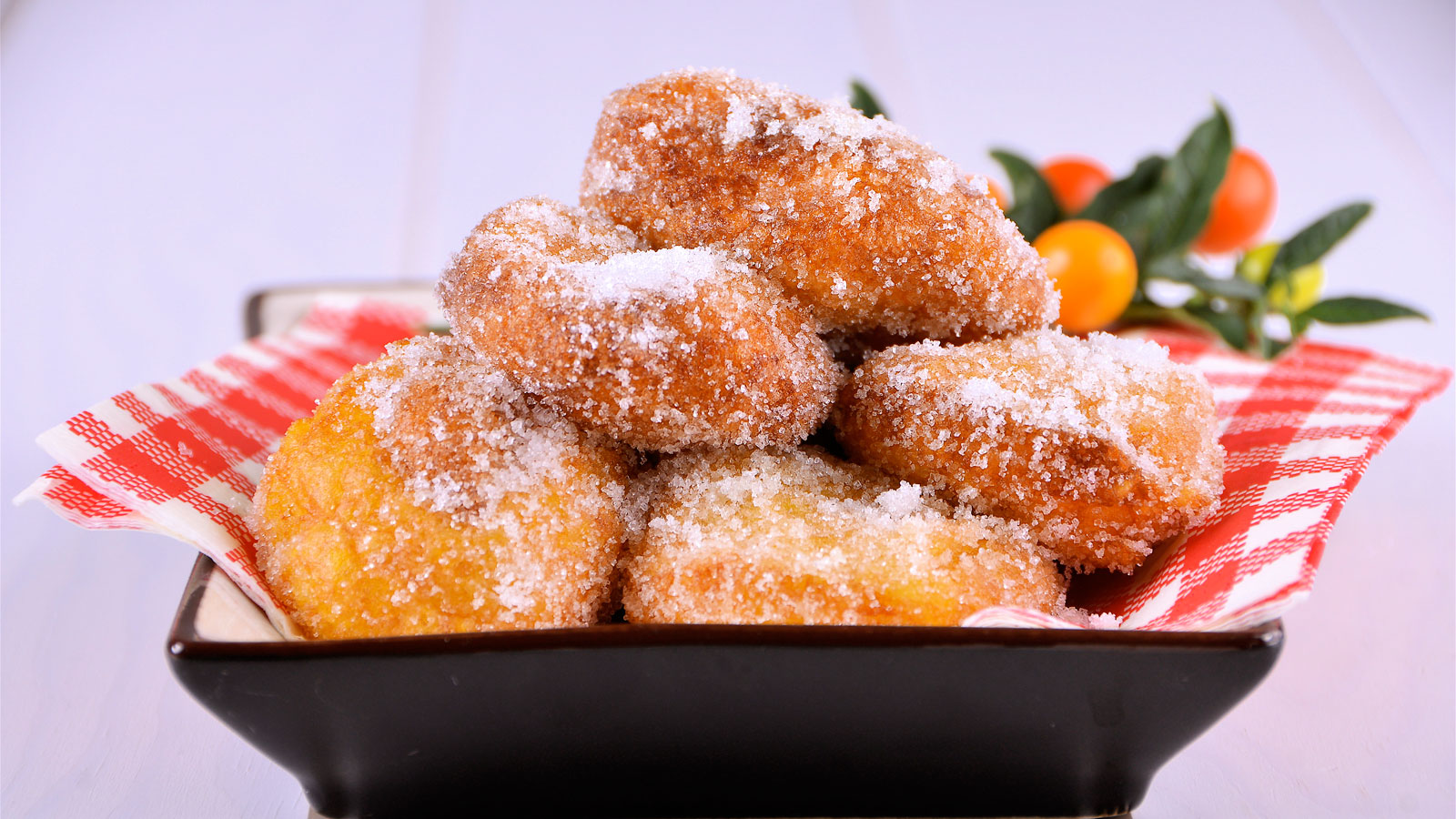 Rebozamos en azúcar los buñuelos y emplatamos.