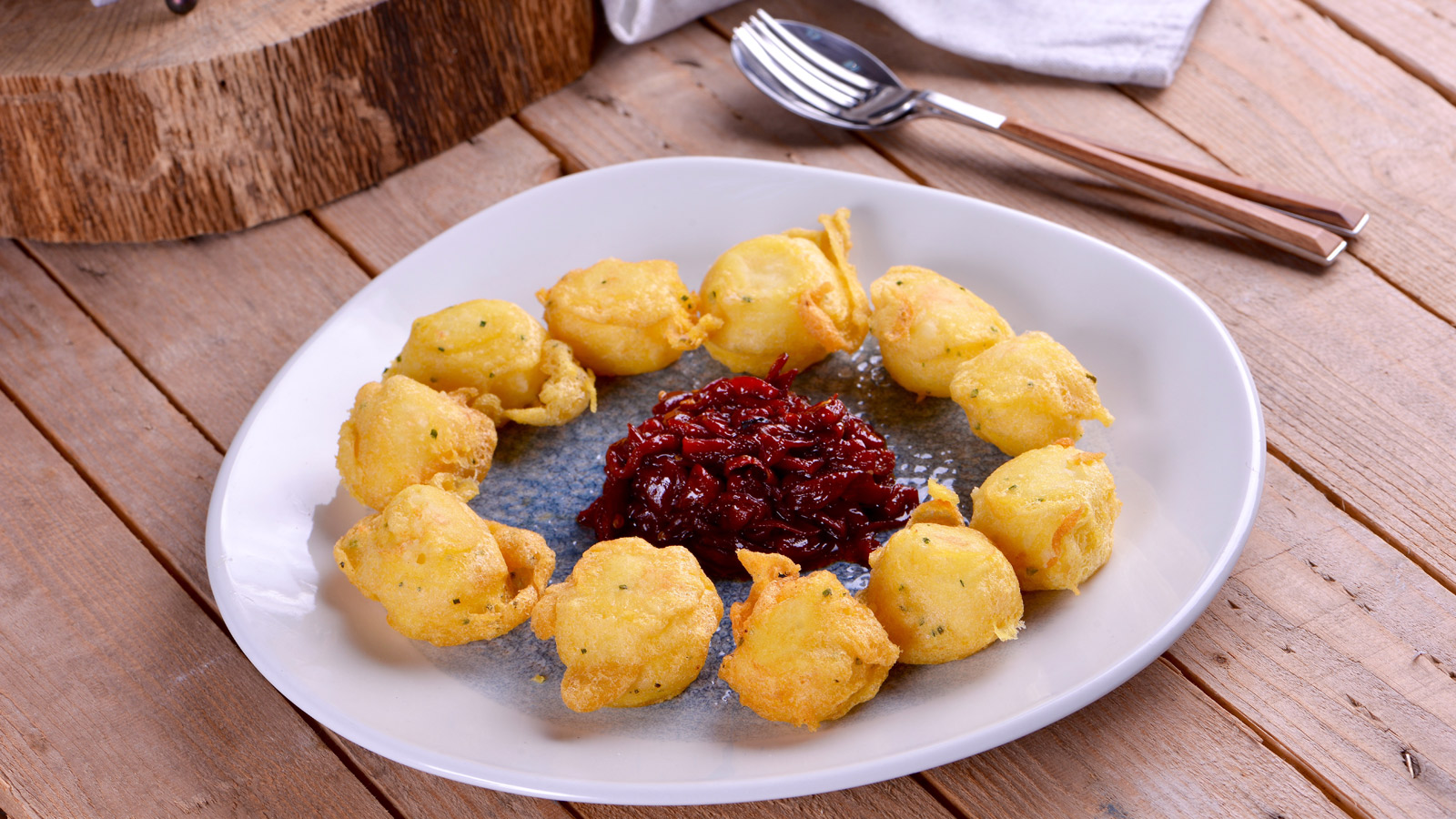 Buñuelos de Idiazábal con piquillos confitados
