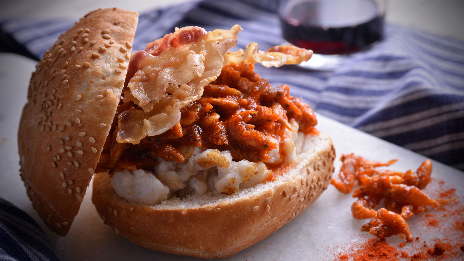 Burger de rape con tocino crujiente y camarones a la barbacoa