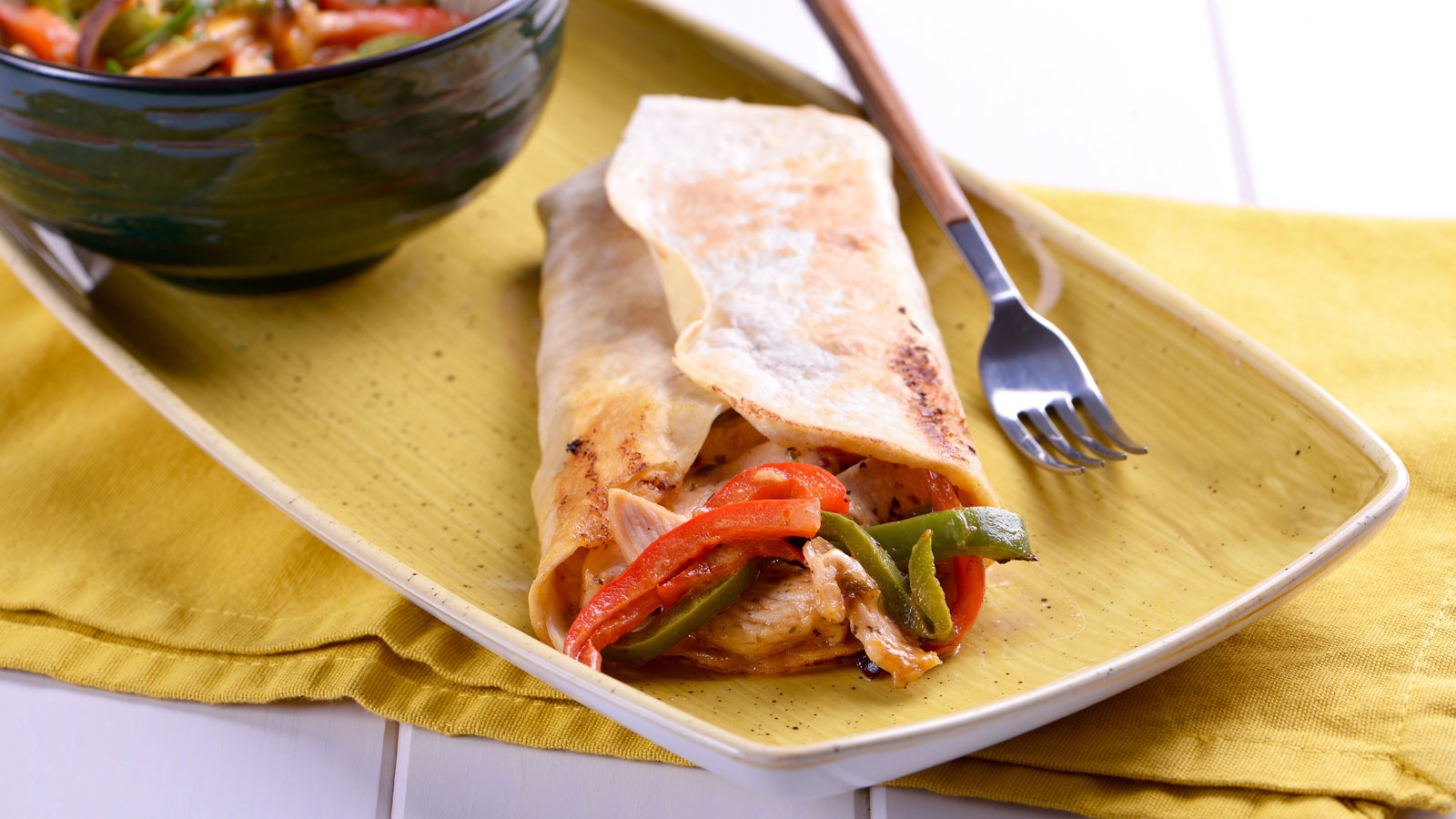 Montamos el burrito con el pollo y las verduras. Cerramos y ponemos en la sartén por el lado del pliegue para que se dore.