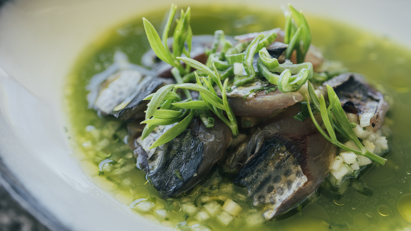 Caballa braseada con vinagreta de manzana y ensalada de hierbas