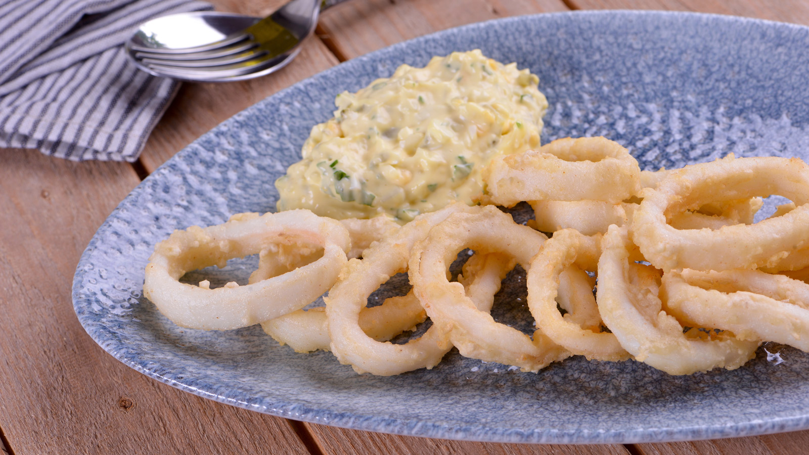 Añadimos harina y agua helada a los calamares y freímos en una sartén con aceite caliente. Escurrimos y servimos con la salsa tártara.