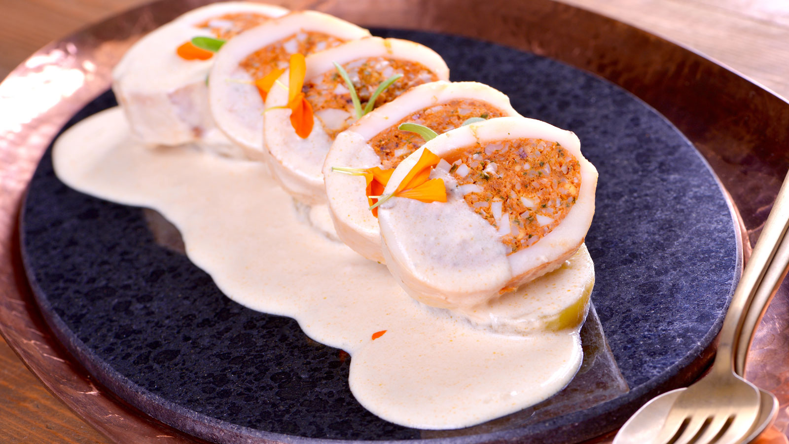 En el capítulo 1 del programa de televisión Blanca Navidad, Blanca Mayandía prepara la receta de Calamares rellenos a la menorquina.