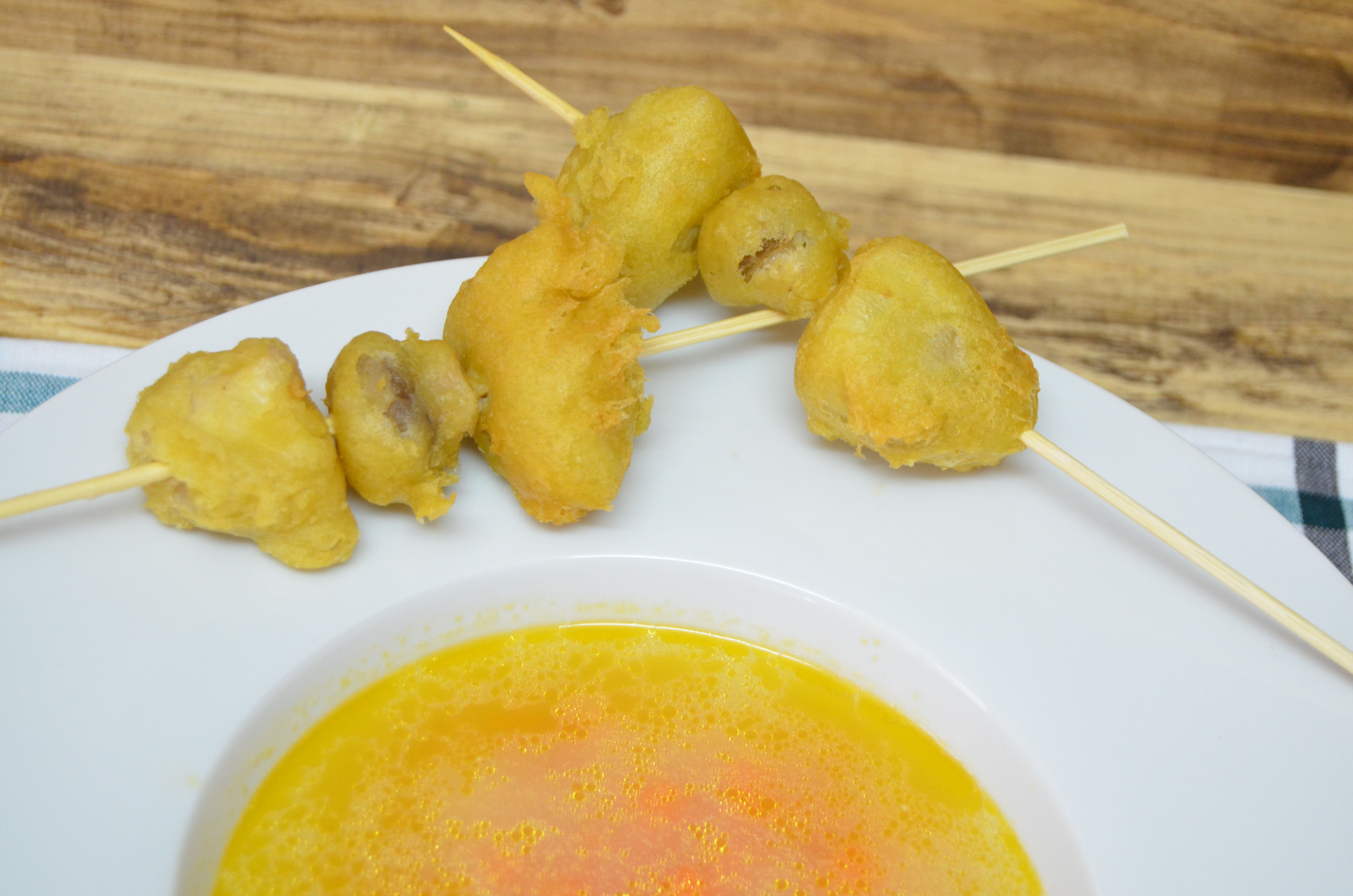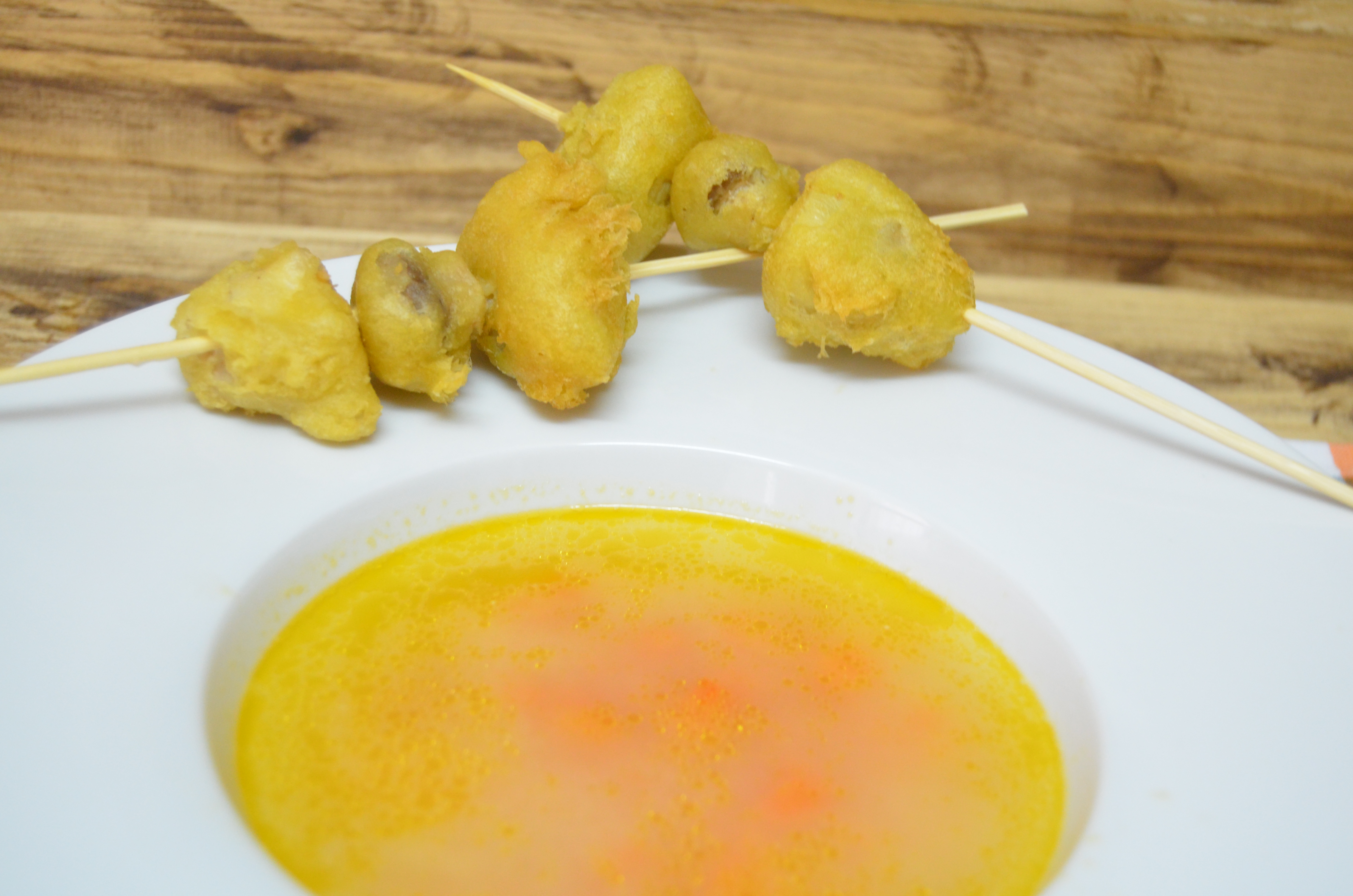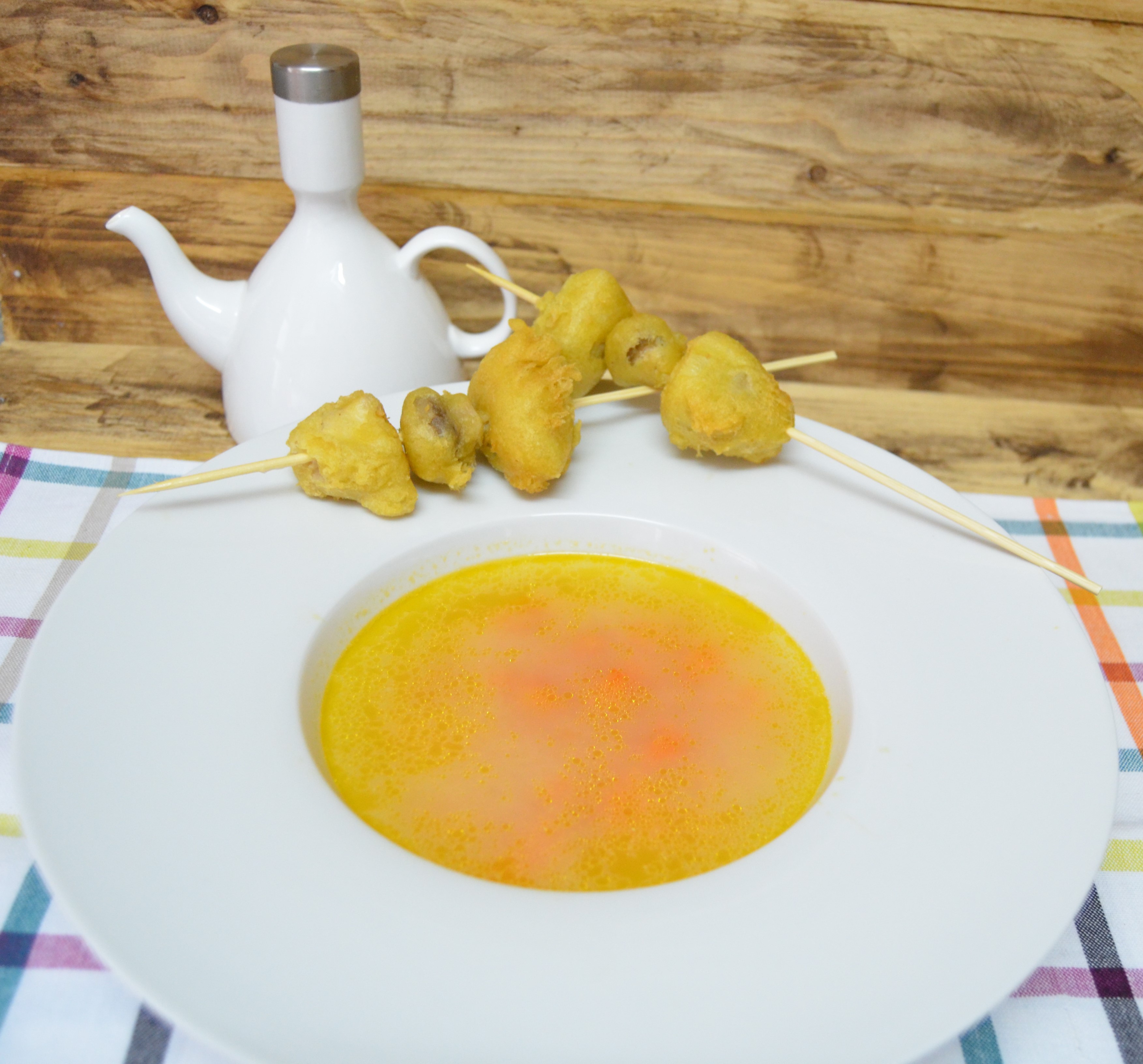 Ponemos el caldo en un plato hondo y lo acompañamos con las verduras en tempura pinchadas como unas brochetas.