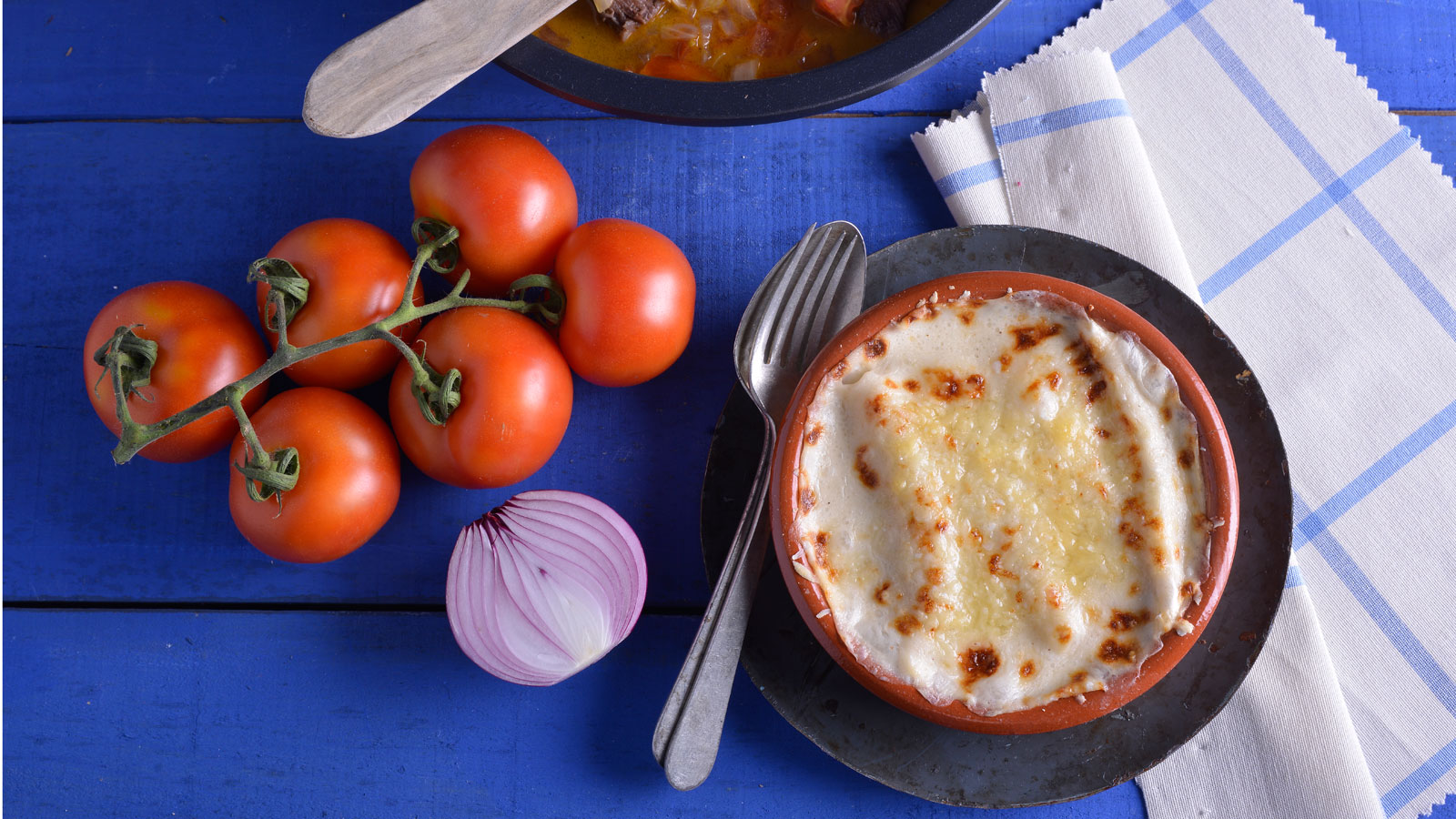 Montamos los platos en cazuelas de barro individuales. Cubrimos el fondo de bechamel, añadimos los canelones por encima y vertemos más bechamel y queso rallado.