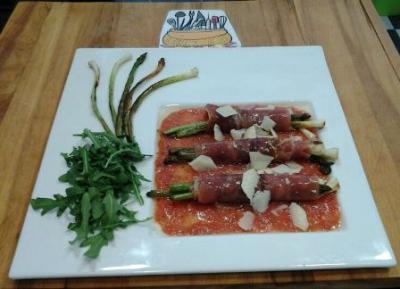 •Se presenta poniendo en la base del plato, una capa de salmorejo ligero, sobre ésta los “canelones” de jamón. Se acompañan de algunos ajetes tiernos más, un poco de rúcula y opcionalmente unas lascas de queso curado.