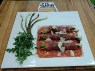 •Se presenta poniendo en la base del plato, una capa de salmorejo ligero, sobre ésta los “canelones” de jamón. Se acompañan de algunos ajetes tiernos más, un poco de rúcula y opcionalmente unas lascas de queso curado.