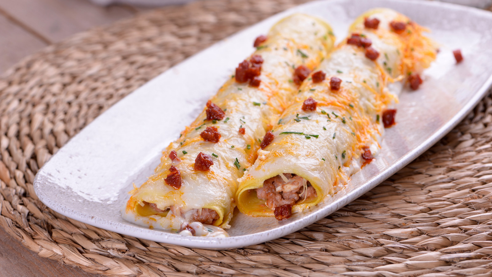 Al sacar los canelones, agregamos el chorizo por encima y añadimos cebollino picado.