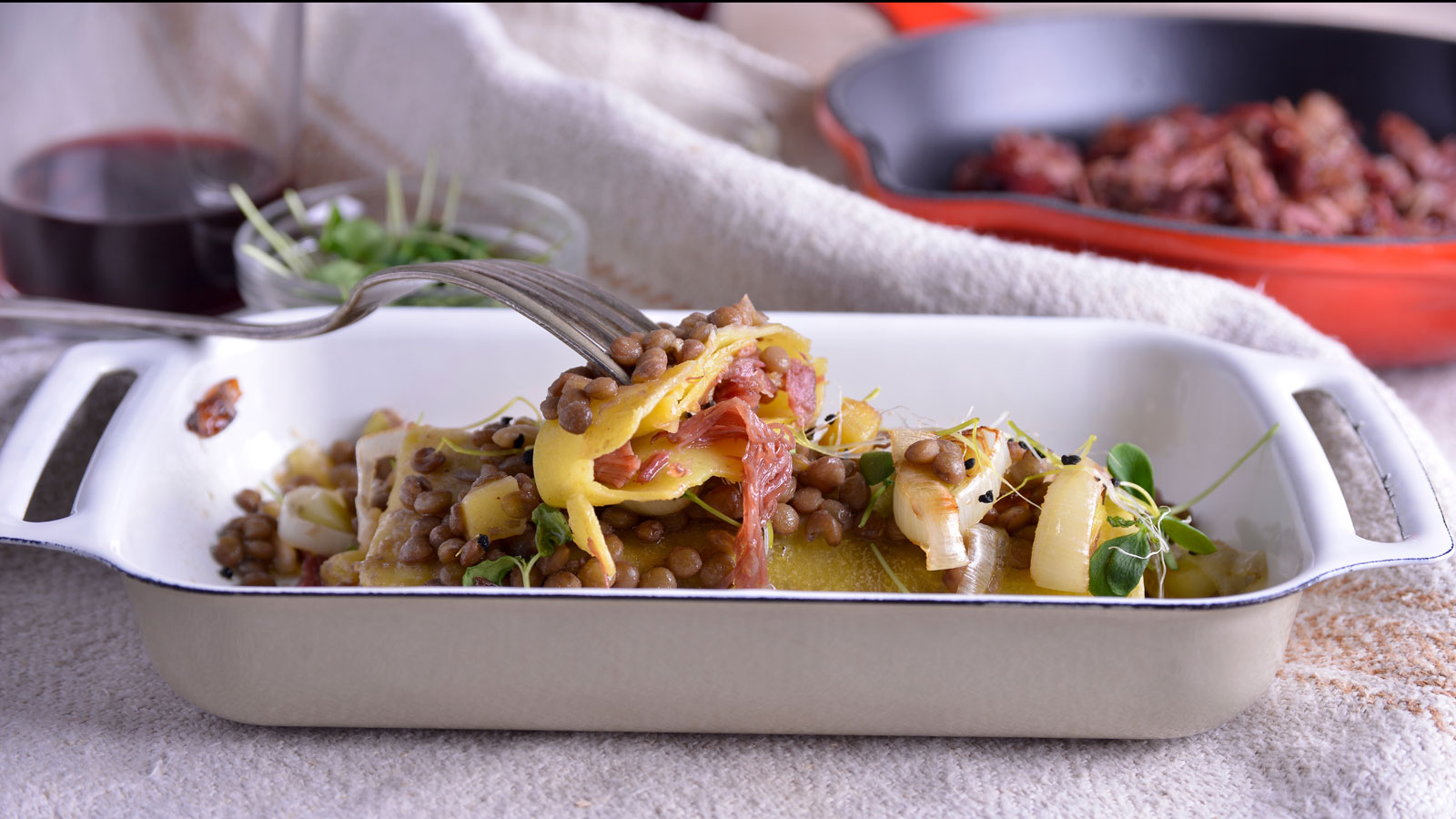 Emplatamos los canelones y los acompañamos con las lentejas. Decoramos con sakura.