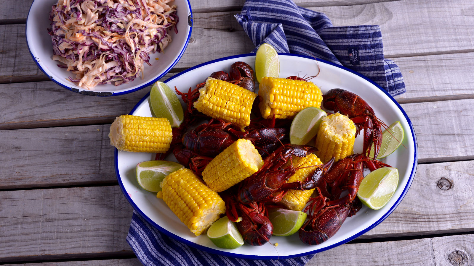 Sacamos los cangrejos y las mazorcas de la olla, los escurrimos y los ponemos en una fuente hermosa.