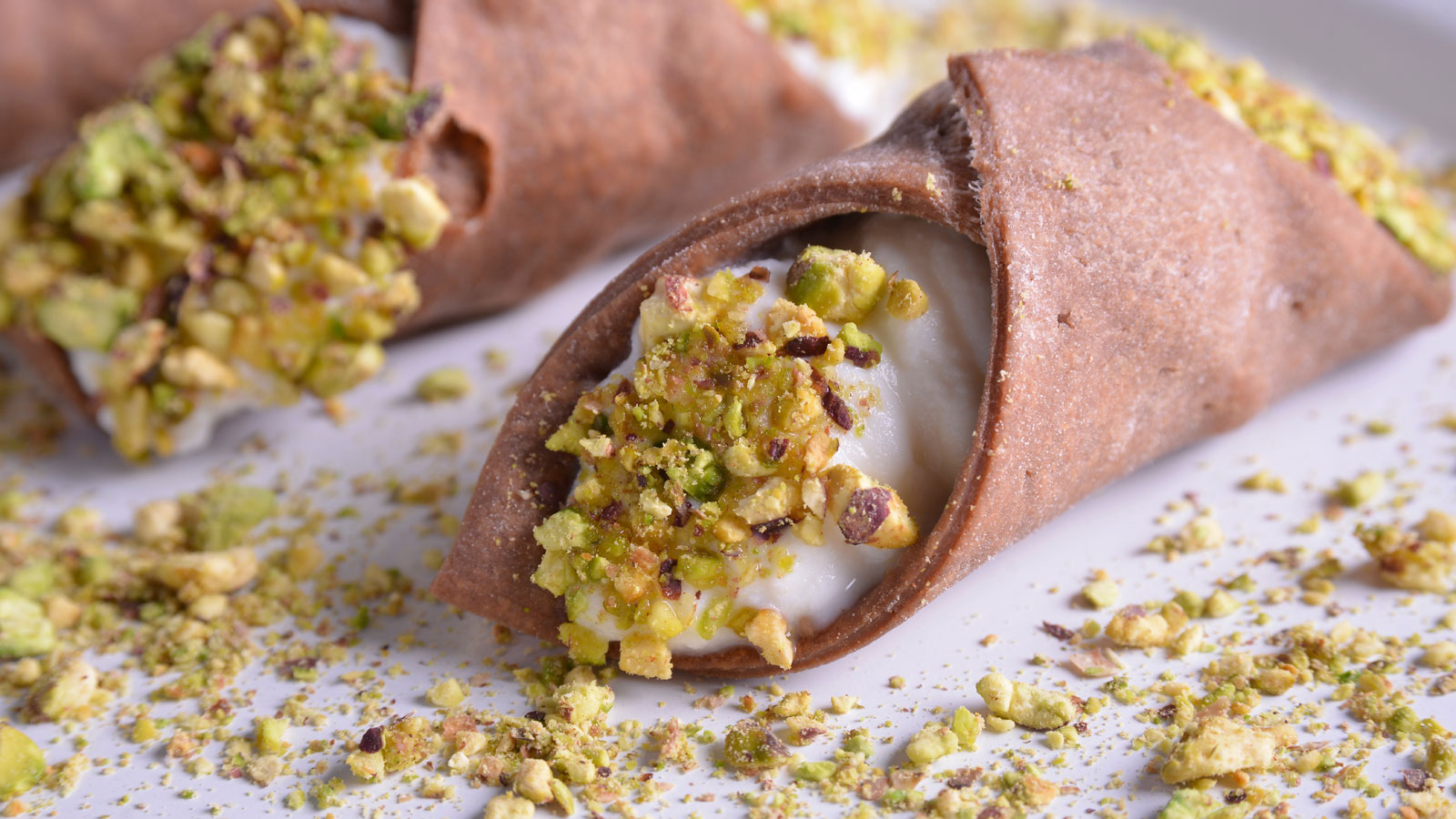 Rellenamos nuestros cannoli con la crema de la manga pastelera y terminamos espolvoreando los pistachos picados en cada extremo.