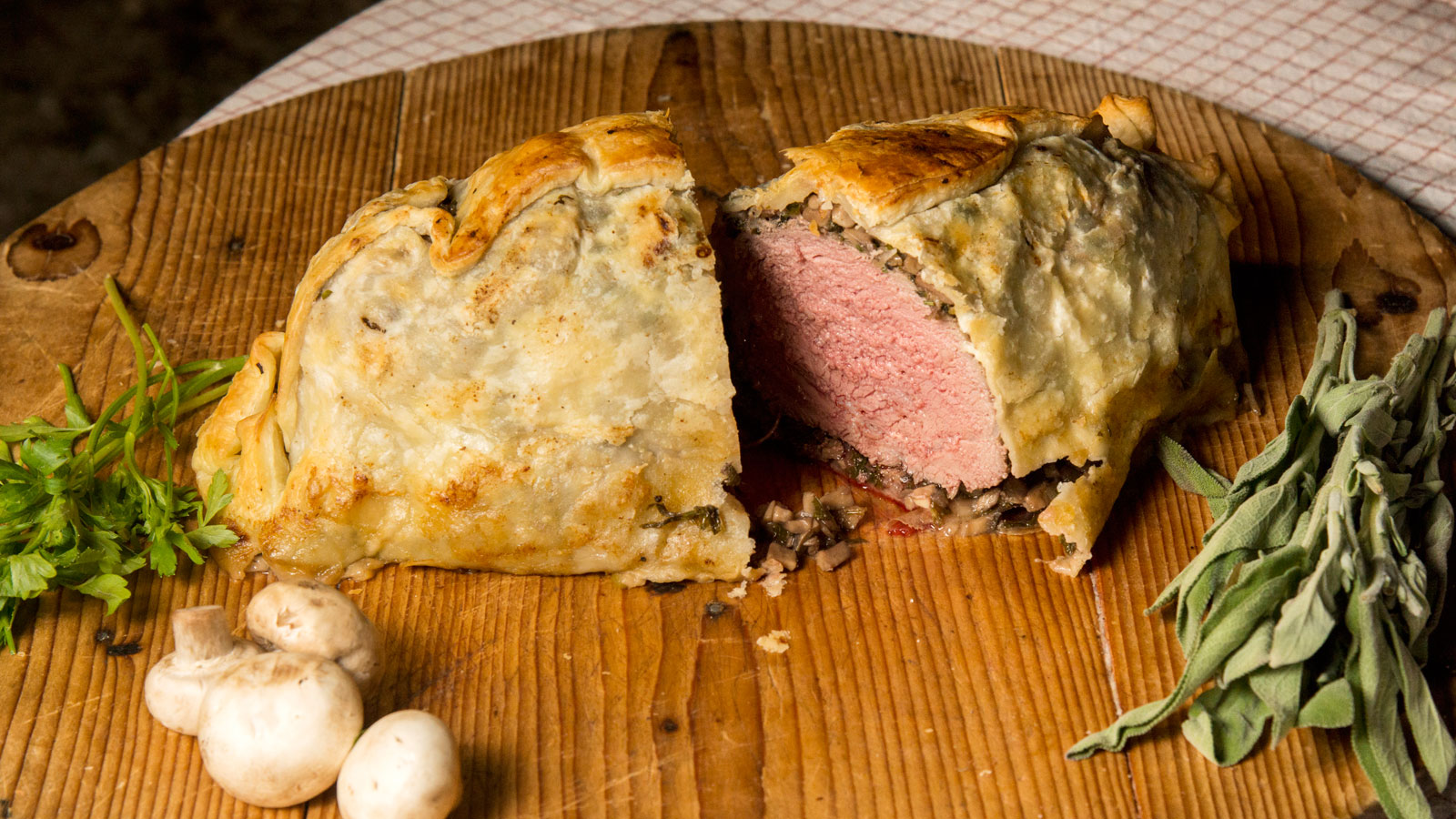 Cubrimos el cantero con el resto de los champiñones salteados. Inmediatamente, tapamos la carne completamente con el hojaldre.