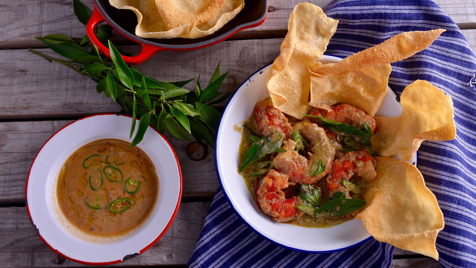 Pasado ese tiempo, emplatamos nuestros carabineros acompañándolos con el papadam y la salsa de curry. Decoramos con unas hojas de albahaca y servimos.