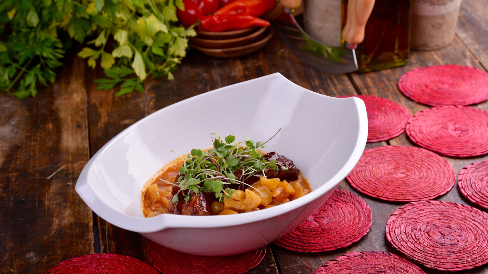 Para finalizar, servimos el estofado de patatas (carapulcra) en un plato hondo y colocamos encima las costillas glaseadas. Decoramos con un mix de brotes de verduras.