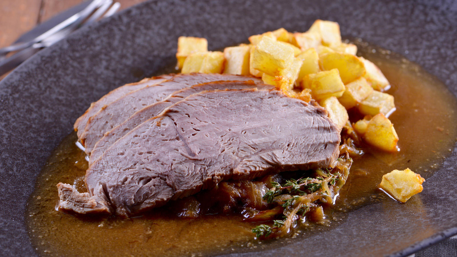 Servimos la carne, salseamos y acompañamos con las patatas.