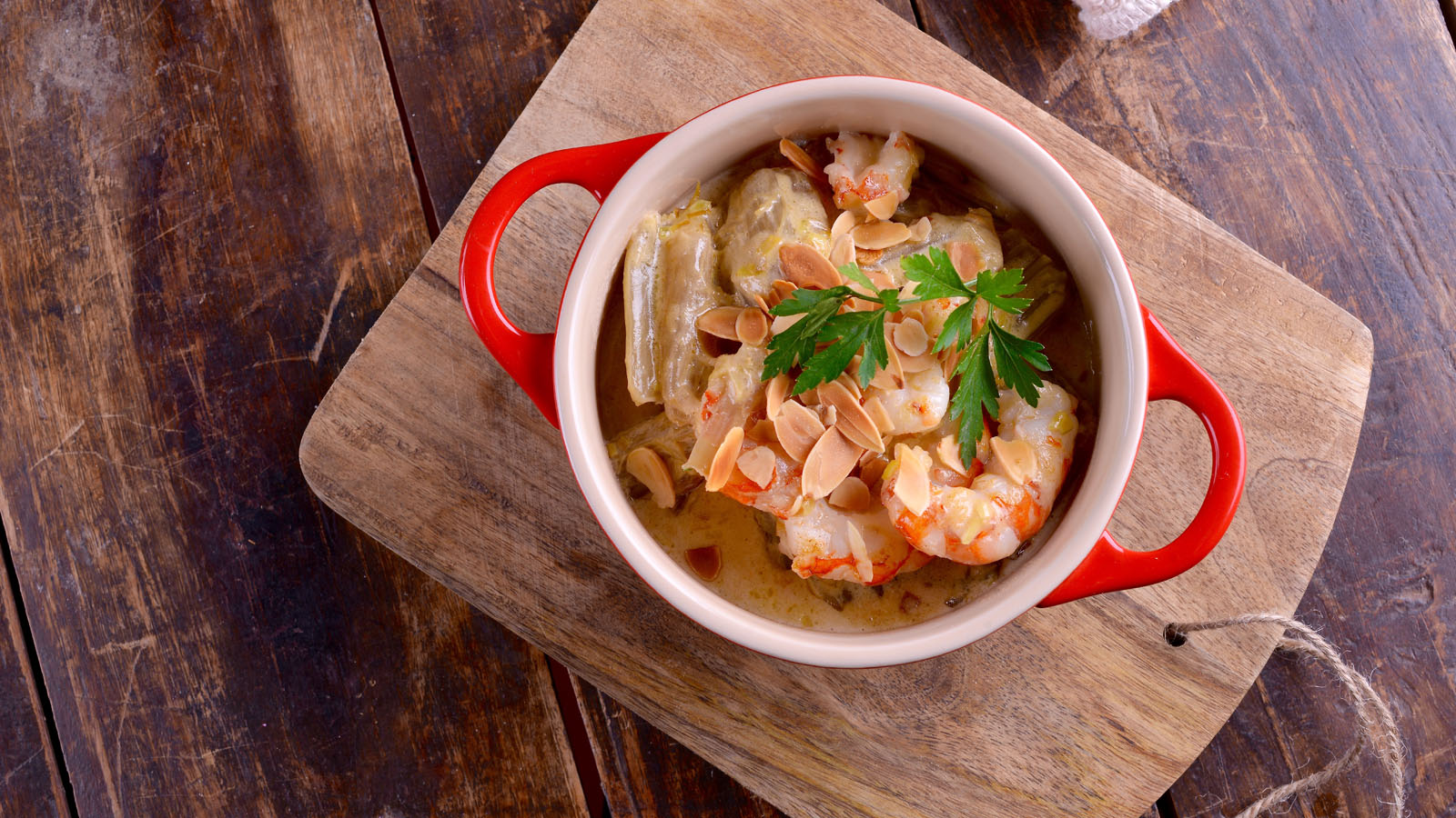 Servimos los cardos y los gambones juntos en una cazuela pequeña y decoramos con 100 g de almendra fileteada.