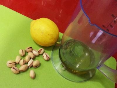 También vamos a hacer el aceite para servirlo junto al carpaccio y para ello, echamos en un vaso batidor el aceite, el perejil, los pistachos pelados, ralladura de la cáscara de un limón y 7 – 10 gotas de vinagre de Jerez. Con la batidora unimos todo y reservamos para que el aceite vaya también cogiendo los aromas de los ingredientes que le hemos añadido.